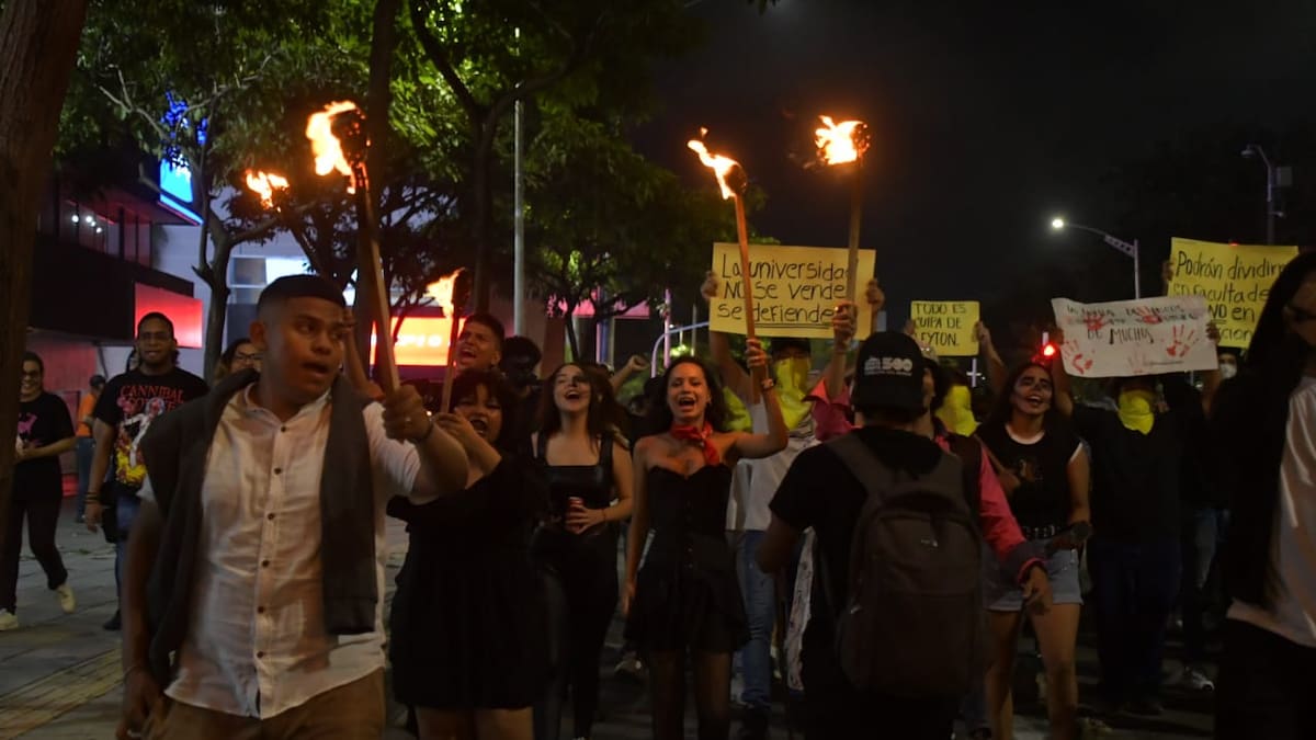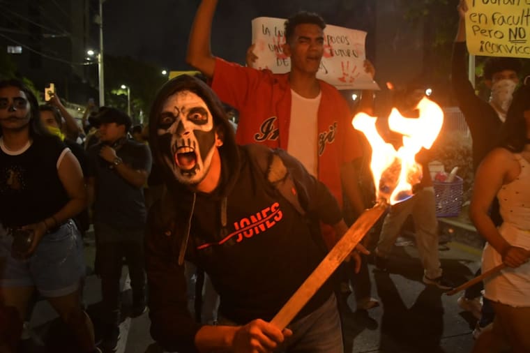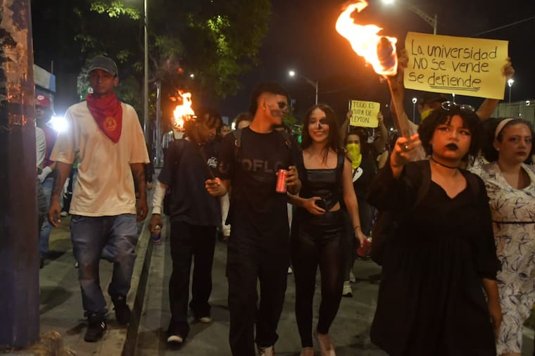 Esta manifestación, denominada ‘la marcha de las antorchas’, empezó en la Plaza de la Catedral sobre las 7 de la noche. Con disfraces de todo tipo, arengas, pancartas y dos carsaudios, los alumnos de la Uniatlántico protestan en la noche de este viernes 31 de octubre, en la que se celebra el Halloween.