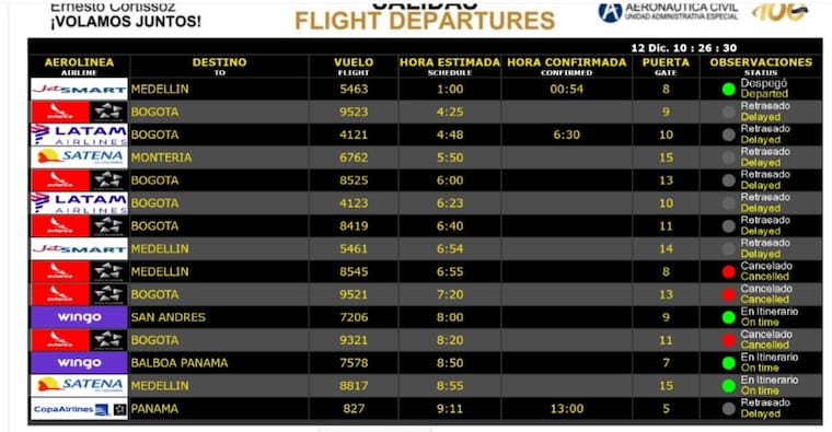 De acuerdo con la página oficial de la Aeronáutica Civil, hay al menos 20 vuelos afectados, ya sea con retrasos o cancelaciones. Las rutas afectadas son hacia Bogotá, Montería, Medellín y destinos internacionales como Panamá.