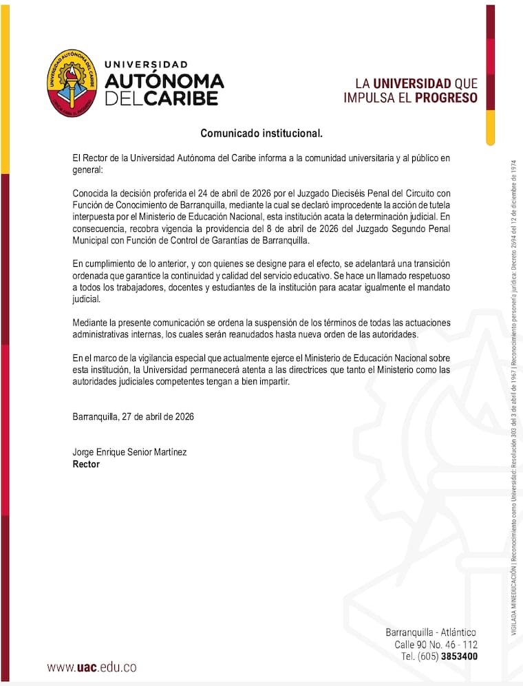 En el marco del caso de Silvia Gette, el rector de la Universidad Autónoma del Caribe, Jorge Senior, informó que la institución acatará la decisión emitida el pasado 24 de abril de 2026 por el Juzgado Dieciséis Penal del Circuito con Función de Conocimiento de Barranquilla, que declaró improcedente la acción de tutela interpuesta por el Ministerio de Educación Nacional.