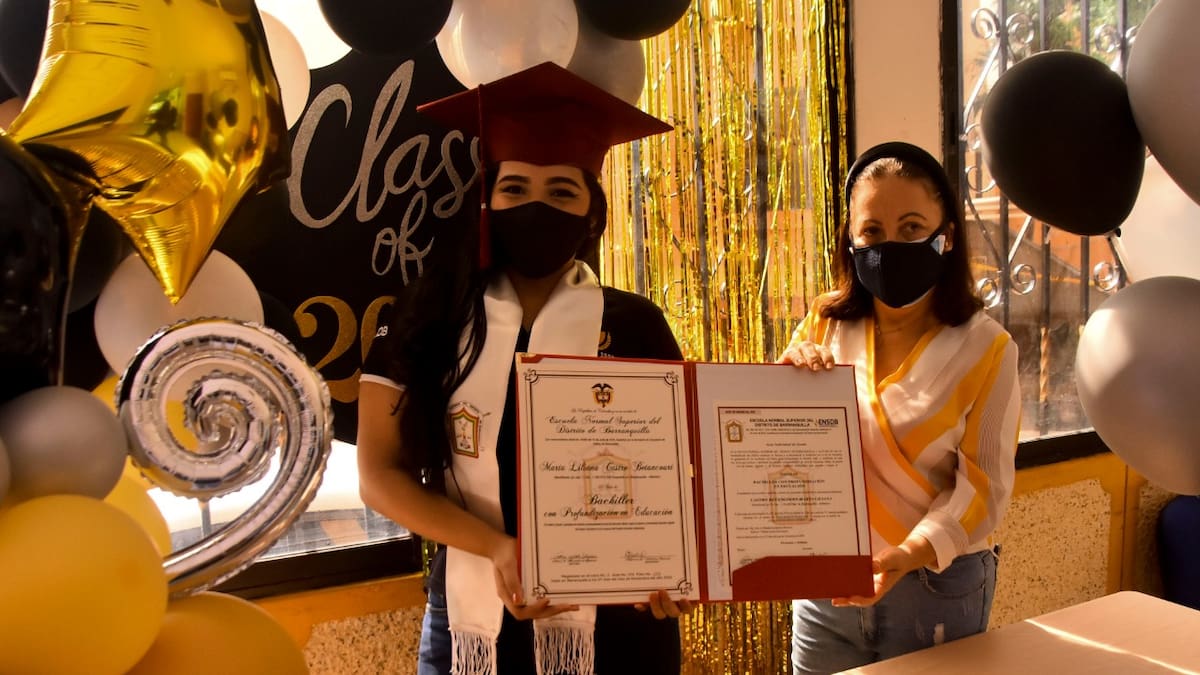 La rectora de la Escuela Normal Superior del Distrito de Barranquilla se las ingenió para que sus estudiantes de once grado pudieran recibir de manera presencial el diploma de grado, tomarse una foto para el recuerdo, pero todo bajo el estricto cumplimiento de los protocolos de bioseguridad.