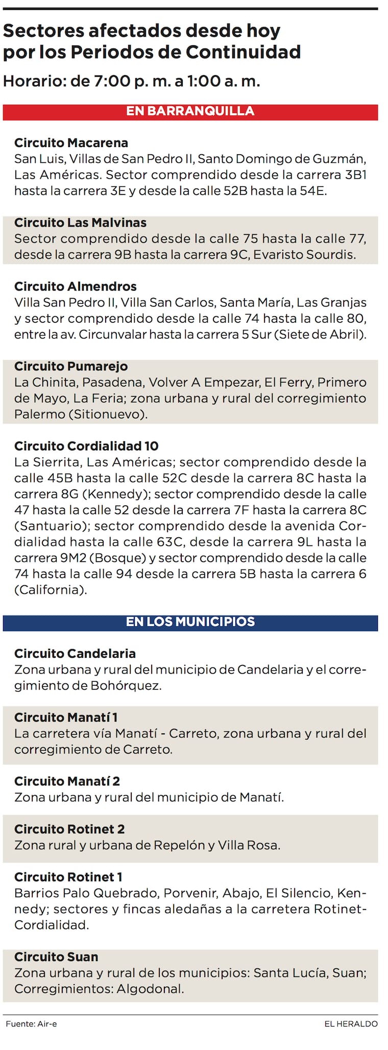 Dicha medida comprende la suspensión del servicio de energía por un periodo promedio de 6 horas al día. En dos sectores del departamento (Malambo y Luruaco) se encuentra en marcha desde el pasado sábado, mientras que a otras 11 zonas se empezará a aplicar desde este miércoles (ver gráfico).