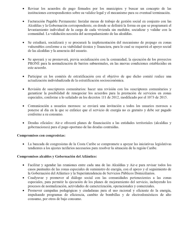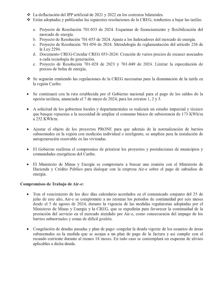 Otro de los compromisos de la Nación es que se seguirán emitiendo las regulaciones de la Creg necesarias para la disminución de la tarifa en la región Caribe. Asimismo, se continuará con la ruta establecida por el Gobierno nacional para el pago de los saldos de la opción tarifaria para los estratos 1, 2 y 3.