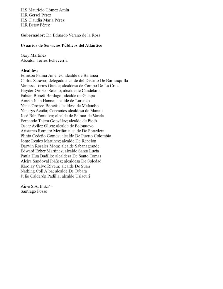 Por otro lado, la bancada de congresistas de la región Caribe indicó que apoyará las iniciativas legislativas tendientes a los ajustes tarifarios necesarios para resolver la situación en el territorio.