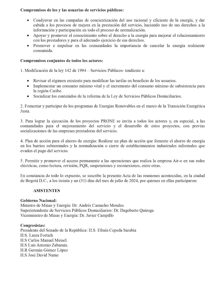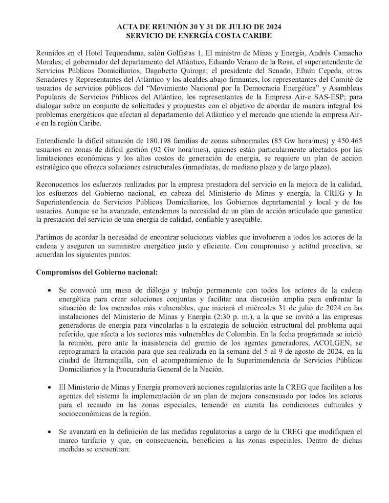 A través de un acta, el Gobierno nacional, la Gobernación, los alcaldes de 21 municipios, miembros de la bancada legislativa del Atlántico y la empresa Air-e firmaron un acta de compromisos tras una serie de reuniones que se adelantaron en la ciudad de Bogotá.