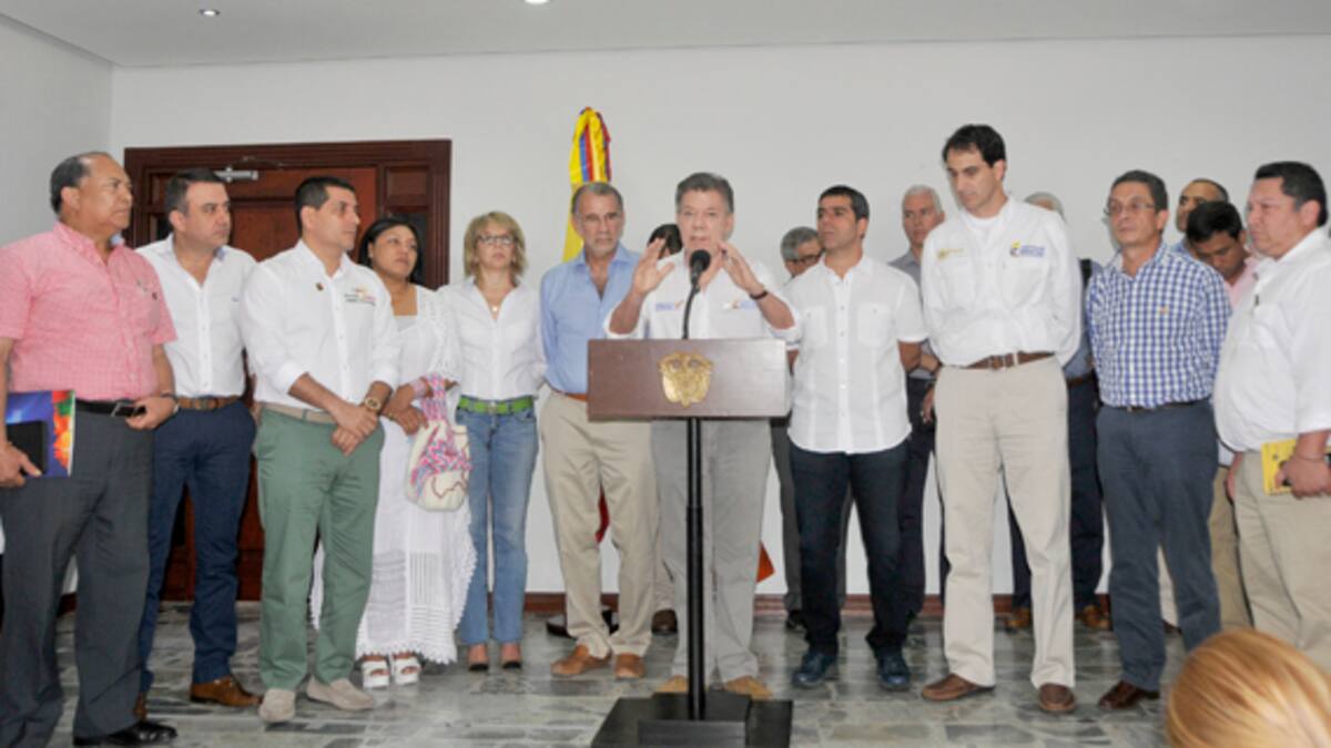 Hasta las 10:30 de la mañana se fue completando el listado de invitados, y subieron al piso 12. Casi hora y media después, el alcalde Alejandro Char, el gobernador Verano y los ministros de Minas (Tomás González) y Hacienda (Mauricio Cárdenas) se retiraron del salón para llegar hasta el ‘lobby’ donde esperaron a Santos para llevarlo hasta el sitio de la reunión. Entró saludando de mano a la mayoría de los presentes, a otros simplemente los miró, sonrió, y alzó la mano a la distancia. 'Vengo con la mejor disposición de solucionar el problema', expresó el presidente a los asistentes.