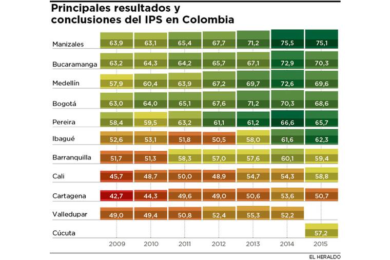 El top es liderado por Manizales y seguido por Bucaramanga, Medellín, Bogotá, Pereira, Ibagué, Barranquilla, Cali, Cúcuta y Cartagena (ver tabla). En términos generales, los resultados revelan un rompimiento de la tendencia de crecimiento del país, que se mantenía desde 2009 a 2014, cuando crecía un 3.3%cada año en siete de las nueve ciudades, teniendo en cuenta que Cúcuta es la primera vez que participa.