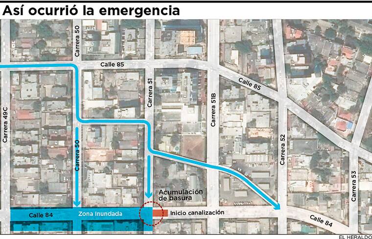 El secretario de Infraestructura, Rafael Lafont, realizó un recorrido por la zona afectada y habló con habitantes para indagar la razón de la inundación. Según el funcionario el fuerte aguacero hizo que el arroyo de la 85 se desbordara. Indicó que este baja por la carrera 50, tiene un desvío por la calle 84B y pasa a la carrera 51. Allí –precisó – pasa por un túnel que va por debajo de la 51B y llega hasta la calle 84, sale por Petromil (en la carrera 52), para que las aguas lleguen a la zona de canalización.