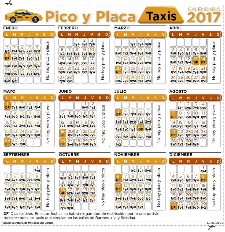 La Secretaria de Movilidad Distrital anunció que el ‘pico y placa’ para los taxis que operan en Barranquilla se mantendrá vigente en 2017. Los taxistas deberán regirse por el nuevo calendario oficial que está socializando la Secretaría.