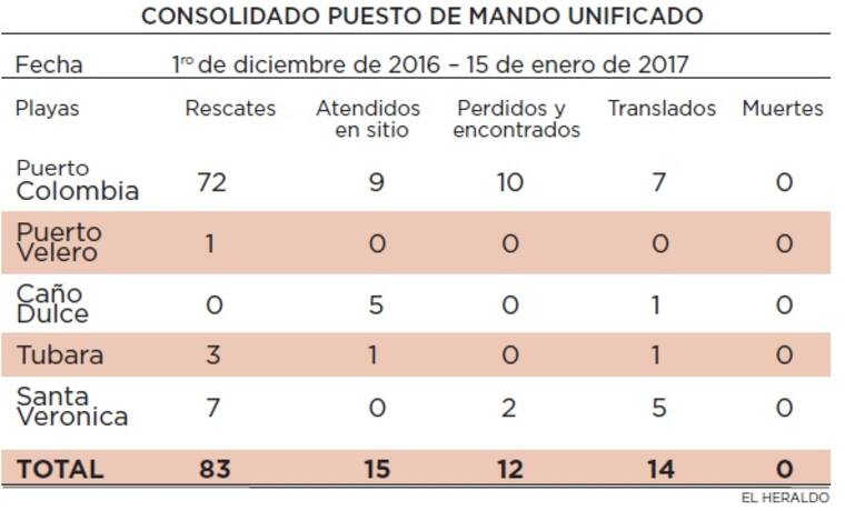 Al igual que la pareja, otras 70 personas fueron rescatadas en los balnearios de Puerto desde el primero de diciembre de 2016 hasta el 15 de enero del presente año. En las playas de Tubará, se registraron cuatros casos; uno en Puerto Velero y tres en playa Tubará. En Caño Dulce no hubo casos.