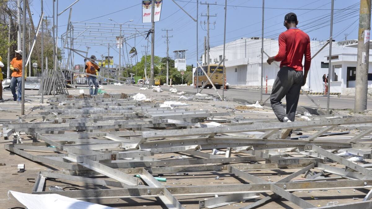 Los operadores de los palcos realizan el desmonte de las estructuras instaladas en la Vía 40 para los desfiles de Batalla de Flores, Gran Parada y Gran Parada de Fantasía que se realizaron los días de Carnaval.