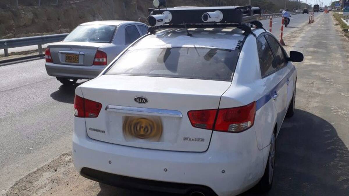 Usuarios de redes sociales hicieron públicas este miércoles las imágenes de un vehículo KIA Cerato Forte color blanco, con franjas azules a los costados, y que en el techo tiene varias cámaras de video, similares a las que usan los negocios para la llamada 'video-vigilancia'.