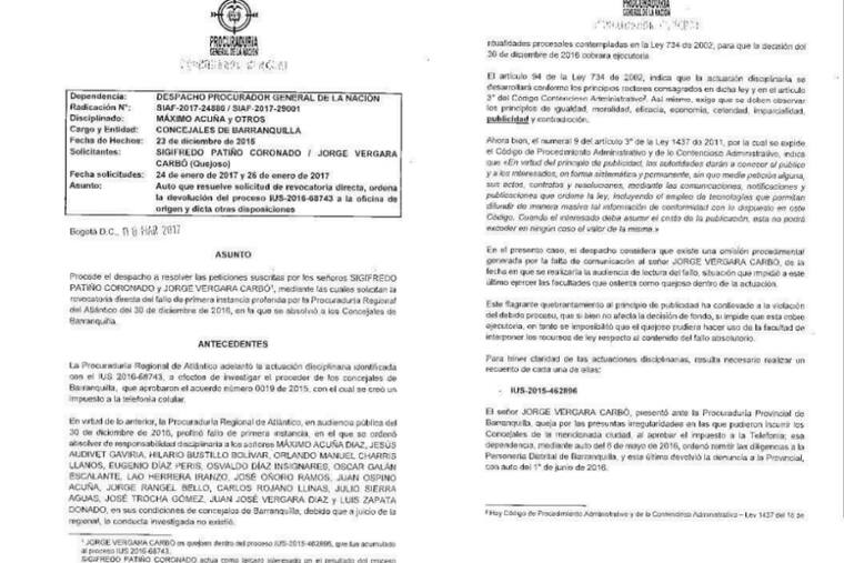 Declara 'improcedente el estudio de las revocatorias directas presentadas por los señores Sigifredo Patiño Coronado y Jorge Vergara Carbó, contra el fallo absolutorio proferido por la Procuraduría Regional del Atlántico el 30 de Diciembre de 2016', y ordena que Vergara Carbó pueda presentar sus argumentos en una nueva audiencia.