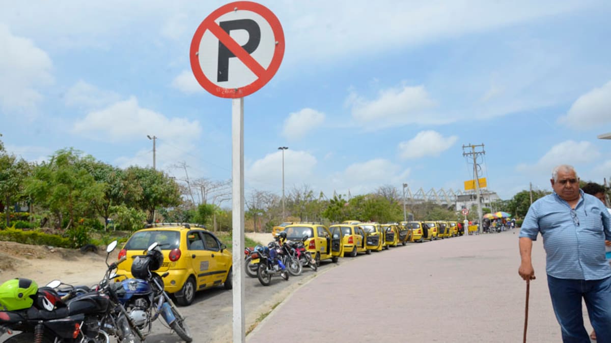 Pese a una señal de prohibido parquear, una fila de más de 15 taxis se estacionan en la oreja. Algunos conductores tratan de explicar su decisión vial con el argumento de que 'no hay una bahía para estar y esperar a los clientes que salen del centro comercial'.
