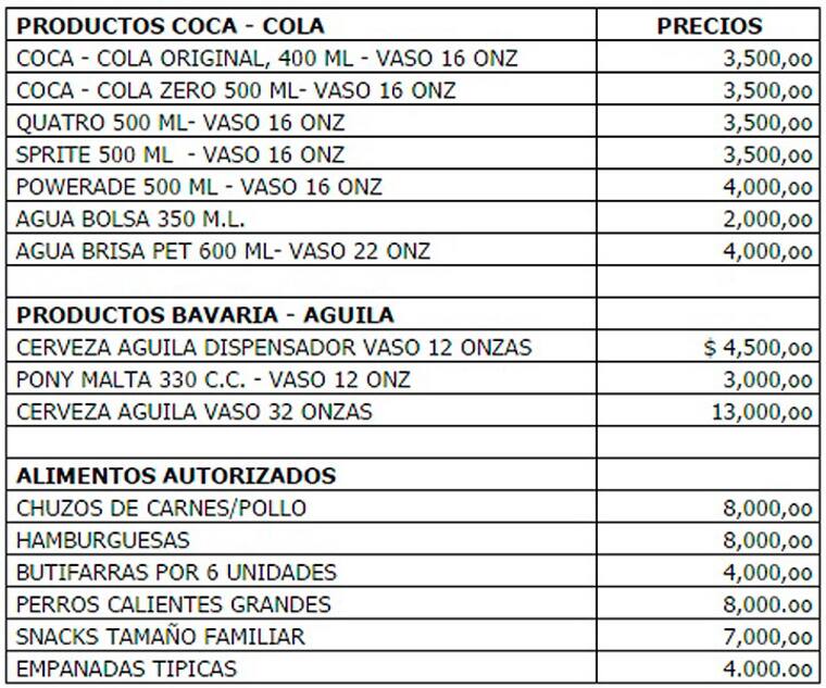 Las autoridades dieron a conocer este martes los precios autorizados de las 52 cafeterías del estadio Metropolitano para el juego de fútbol entre las selecciones de Colombia y Bolivia que se llevará acabo el jueves a partir del as 3:30 p.m.