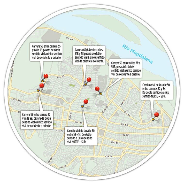 La carrera 33 entre calles 33 y 61, la calle 75 entre carreras 38 y 27. De igual forma la calle 70b entre carreras 38 y 27 y la carrera 42h cambiaría a único sentido vial desde la calle 96 hasta la calle 79B.