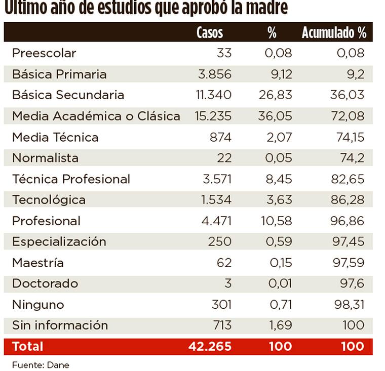 Según cifras del Departamento Administrativo Nacional de Estadística, Dane, de las más de 42 mil mujeres que dieron a luz el año pasado en Barranquilla, el 24,41% ha cursado estudios de educación superior, ya sea carreras tecnológicas, técnicas, profesionales o de posgrados.