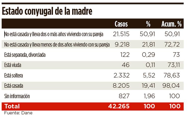 En cuanto al estado civil, las cifras indican que solo el 19% de estas madres barranquilleras están casadas formalmente, mientras que el 72,7% vive en unión libre; el 0,29% está divorciada o separada y el 0,11% es viuda.