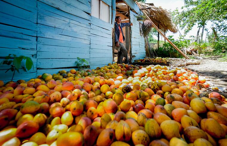 'Cuando este mango estaba amarillo no se veía la tierra de la cantidad que había; y estás viendo a un solo productor que no tiene gran cantidad de árboles', advierte Sarmiento mientras da pasos cautelosos sobre la cosecha perdida, evitando pisar los frutas dañadas para no atraer las avispas. Con cada zancada las hojas secas crujen como un montículo de sal seca.