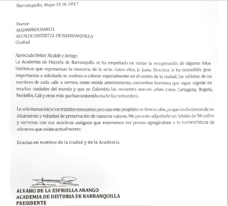 Con la misión de recuperar algunos hitos históricos que representan las memorias de la urbe, la Academia de Historia de Barranquilla le solicitó a la Administración, a través de una carta enviada el pasado 31 de mayo al alcalde Alejandro Char, realizar los trámites necesarios para que la nomenclatura de las vías de la ciudad, especialmente del Centro Histórico, recupere sus nombres originarios. 'Costumbre hermosa que sigue vigente en muchas ciudades del mundo y que en Colombia las encuentra en urbes como Cartagena, Bogotá, Medellín, Cali y otras más que han sostenido esa bella costumbre', detalla el escrito.