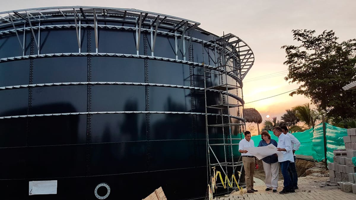 Loretta Jiménez, secretaria de Agua Potable y Saneamiento Básico de la Gobernación del Atlántico, explicó que el tanque está elaborado en vidrio con acero fusionado, tiene 14 metros de altura y 22 de diámetro y está ubicado en la vía que comunica a Juan de Acosta con el municipio de Tubará.