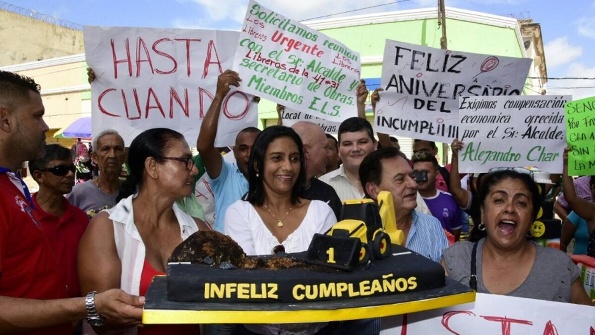 Con arengas, pancartas y hasta un pudín simbólico y real, comerciantes del centro de Barranquilla celebraron en la mañana de ayer el ‘infeliz’ cumpleaños de las obras de peatonalización que aún están inconclusas.