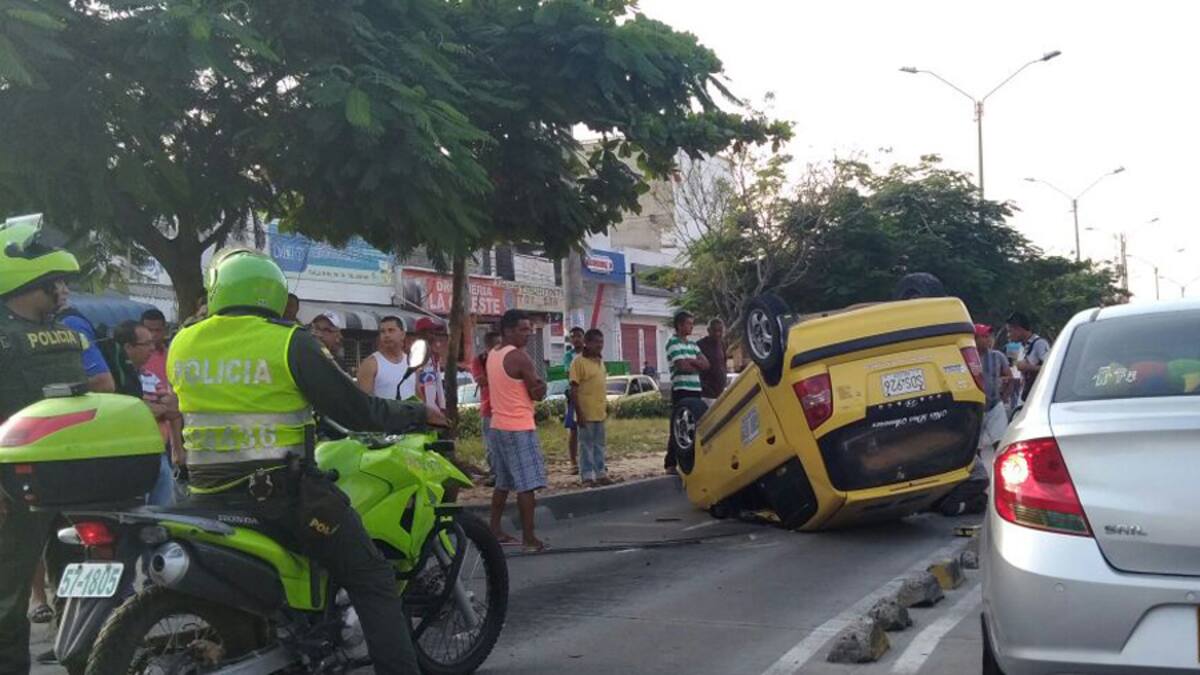 Un taxi zapatico, de placas SDS-926, terminó volcado en el carril del ‘solo bus’ de Transmetro, obstaculizando el paso de los vehículos del servicio de transporte masivo, en sentido norte - sur.