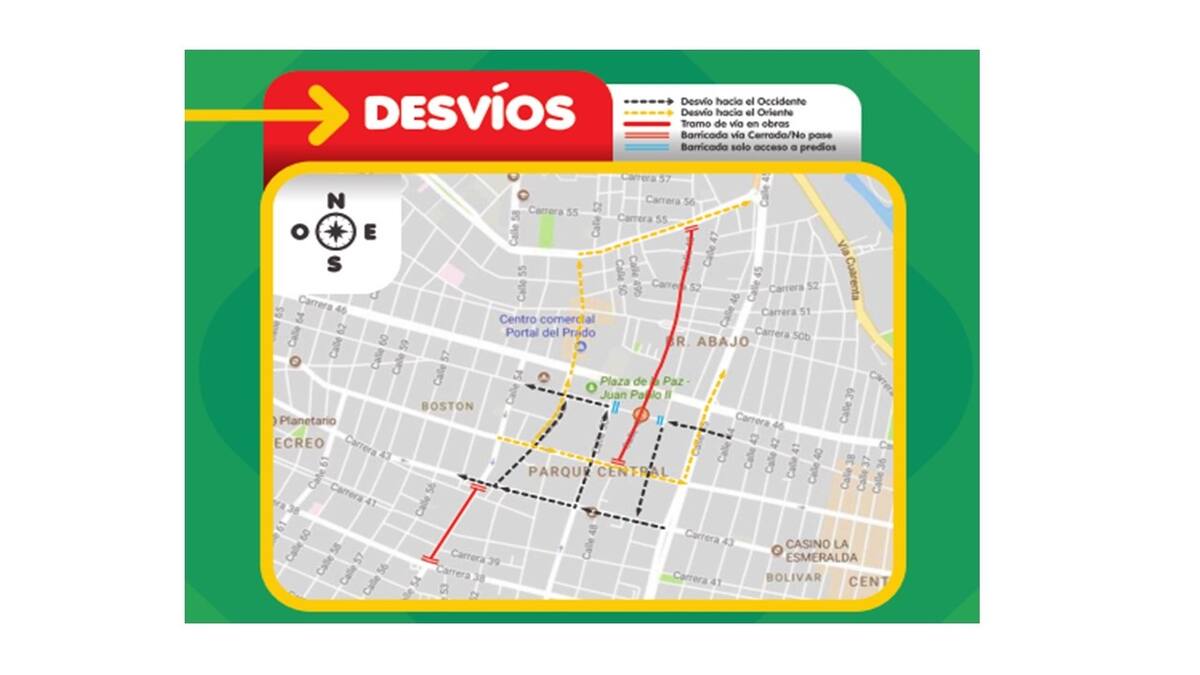 'Los conductores que antes tomaban las carreras 53, 52, 51, 50B, 50 y 45 a la altura del proyecto (calle 48), podrán trasladarse a la carrera 54, 46, 44, 43 y 38 según su conveniencia; y los conductores que antes cruzaban por las calles 48 y 54 a la altura del proyecto, deberán trasladarse a las calles 47, 50, 53 y 56, según su conveniencia', informa la Oficina de Comunicaciones de la la Secretaria Distrital de Tránsito y Seguridad Vial.