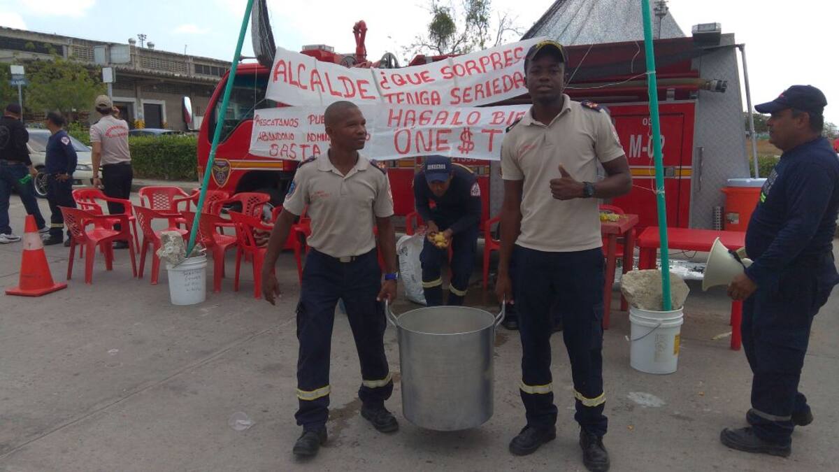 Con pancartas, megáfonos y hasta con sancocho, el Cuerpo de Bomberos de Soledad protesta frente a las instalaciones de la Alcaldía de ese municipio para exigir la renovación de contrato por prestación de servicios y el pago de tres meses de lo pactado en la vigencia 2017.