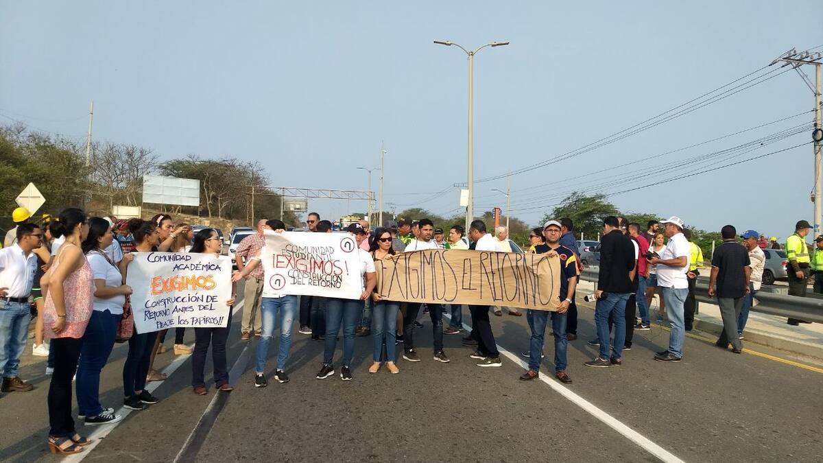 Cerca de 70 padres de familia, algunos abordo de sus carros y otros caminando con pancartas, bloquearon la Vía al Mar por el cierre definitivo de los cuatro retornos ubicados entre el peaje Papiro y la ‘Ye de los Chinos’ en esta autopista.