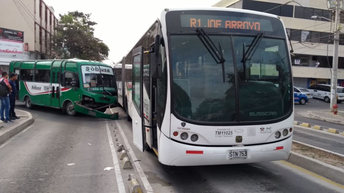 Un accidente entre un bus de Transmetro y una buseta de la empresa Sobusa se registró la mañana de este miércoles en la carrera 46 con calle 56.