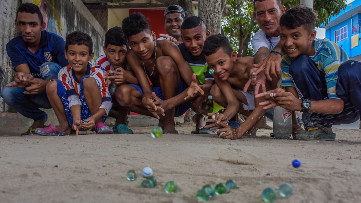 En la carrera 2B con calle 50C, un grupo de nueve hombres, entre los 36 y los 5 años de edad, disputan una competencia de canicas sobre el último espacio de arena que queda en esa esquina, tras ser intervenida la calle antes mencionada, y debajo de un frondoso árbol de mango, que brinda una sombra refrescante.