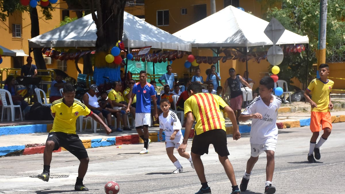 Justo al frente de esta vitrina de premiación, en la carrera 2G con calle 48, estaba el campo de juego de microfútbol, donde se enfrentaban seis integrantes del barrio anfitrión contra sus homólogos de Carrizal.