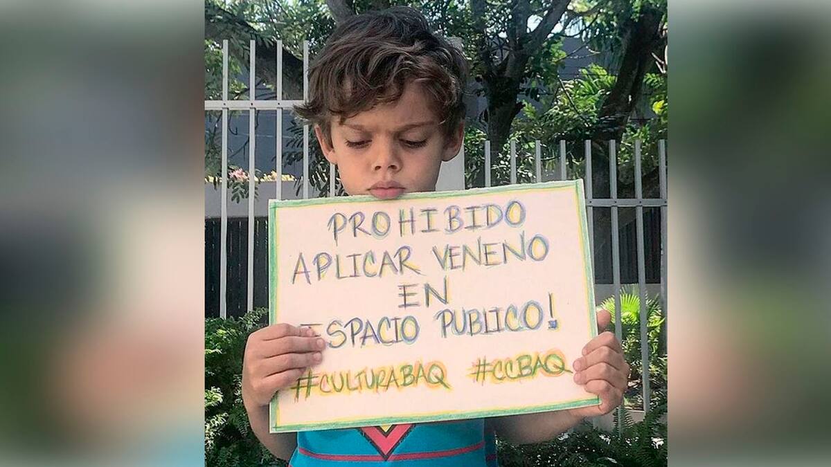 De acuerdo con su padre Jorge Dangond, el niño de cinco años, dolido por el fallecimiento del can decidió salir a la calle a protestar con el siguiente mensaje: 'Prohibido aplicar veneno en espacio público'.