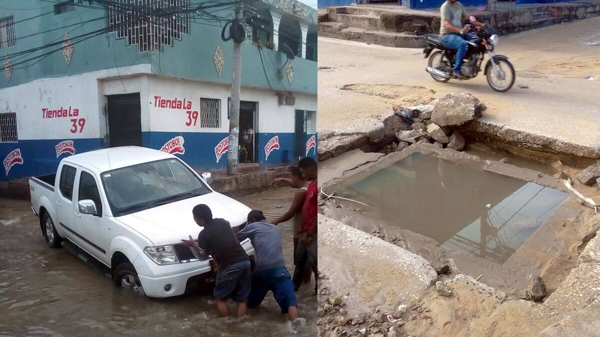 Con la lluvia de este mediodía, una camioneta quedó atrapada y los vecinos del barrio tuvieron que maniobrar para sacarla. 'Han caído al menos cinco motos', advierte el usuario que realiza la denuncia. Como esta joven quien, al parecer, sufrió una caída al no percatarse del peligroso hueco sobre la vía.