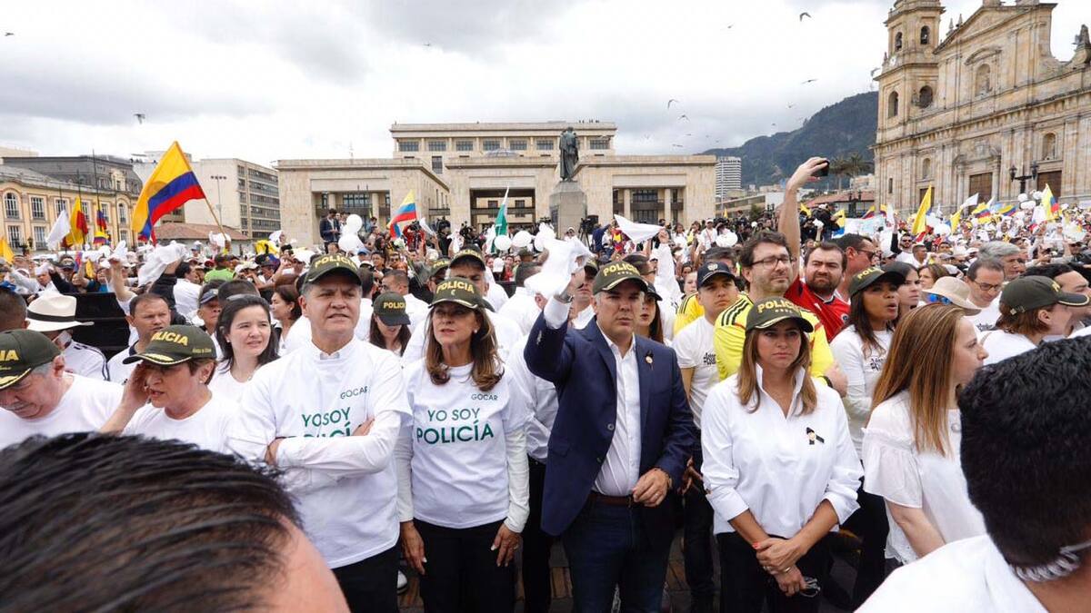 'Hoy venimos todos como ciudadanos y tenemos que marchar honrando a nuestros héroes e invitando a Colombia a unirse para enfrentar esta amenaza y, sobre todo, para sobreponernos como país, dándole un abrazo a todos los integrantes de nuestra Policía y la fuerza pública', dijo a los medios el presidente Iván Duque al inicio de la manifestación.