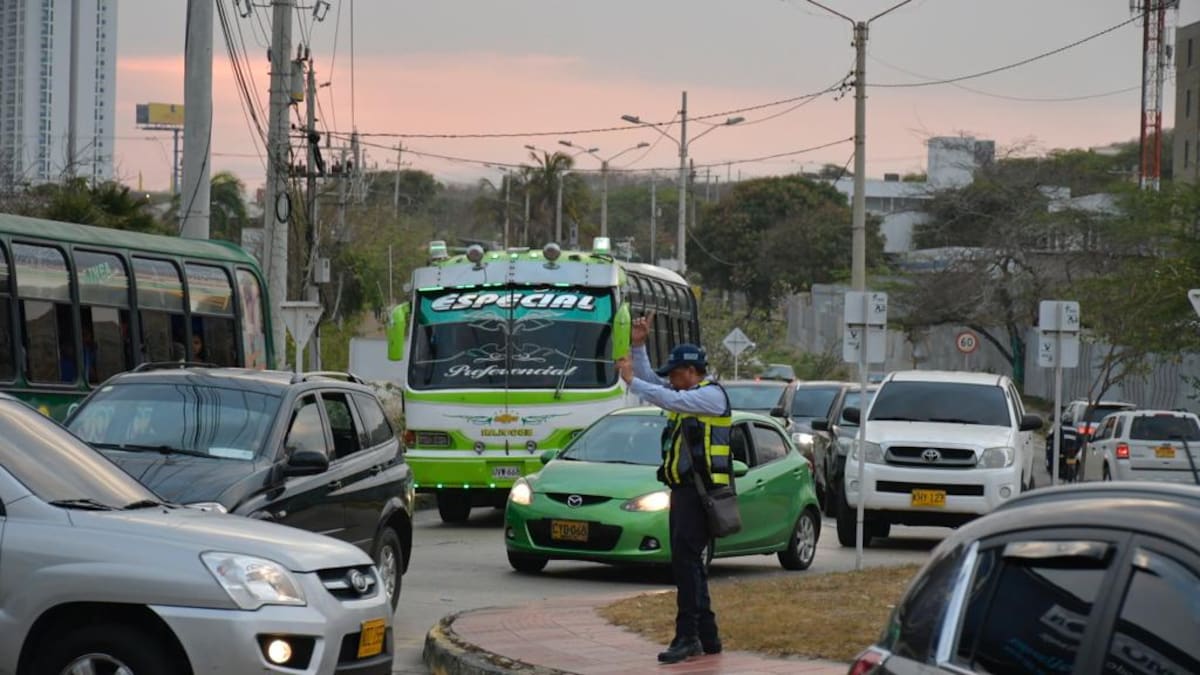 De momento llega un carro con el logo de la Alcaldía de Puerto Colombia y descienden cuatro hombres que portan indumentarias de agentes de tránsito. Uno de ellos se acomoda la gorra, se lleva un pito a la boca y comienza a competir con las bocinas de los carros.