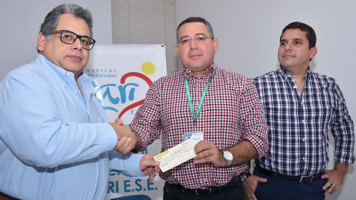Luego de 20 meses el Hospital Universitario Cari E.S.E de alta complejidad volvió a pagar una factura de energía. La tarde de ayer, el gerente de la entidad, Ulahy Beltrán, entregó un cheque al gerente de Electricaribe, Ramiro Castilla, por valor de $49 millones, correspondientes al consumo corriente del mes de enero.
