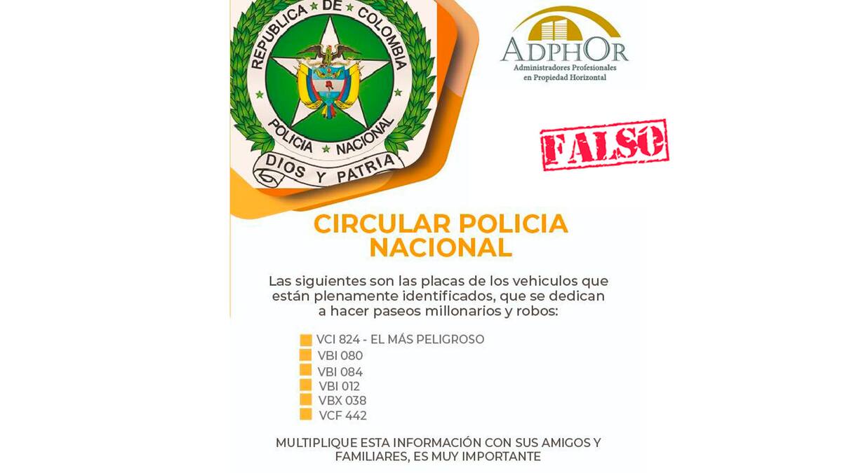 A través de cadenas de Whatsapp circula, desde hace varios días, un mensaje en el que se muestra el logo de la Policía Nacional, haciendo alusión a seis placas de vehículos que supuestamente fueron identificados por las autoridades como bandas delictivas dedicadas a hacer paseos millonarios y robos. La Policía Metropolitana de Barranquilla informó que el mensaje es falso, ya que desde la institución no han enviado ni replicado dicha información. Por lo que piden a la comunidad no replicar estas cadenas a través de redes sociales ni otros canales.