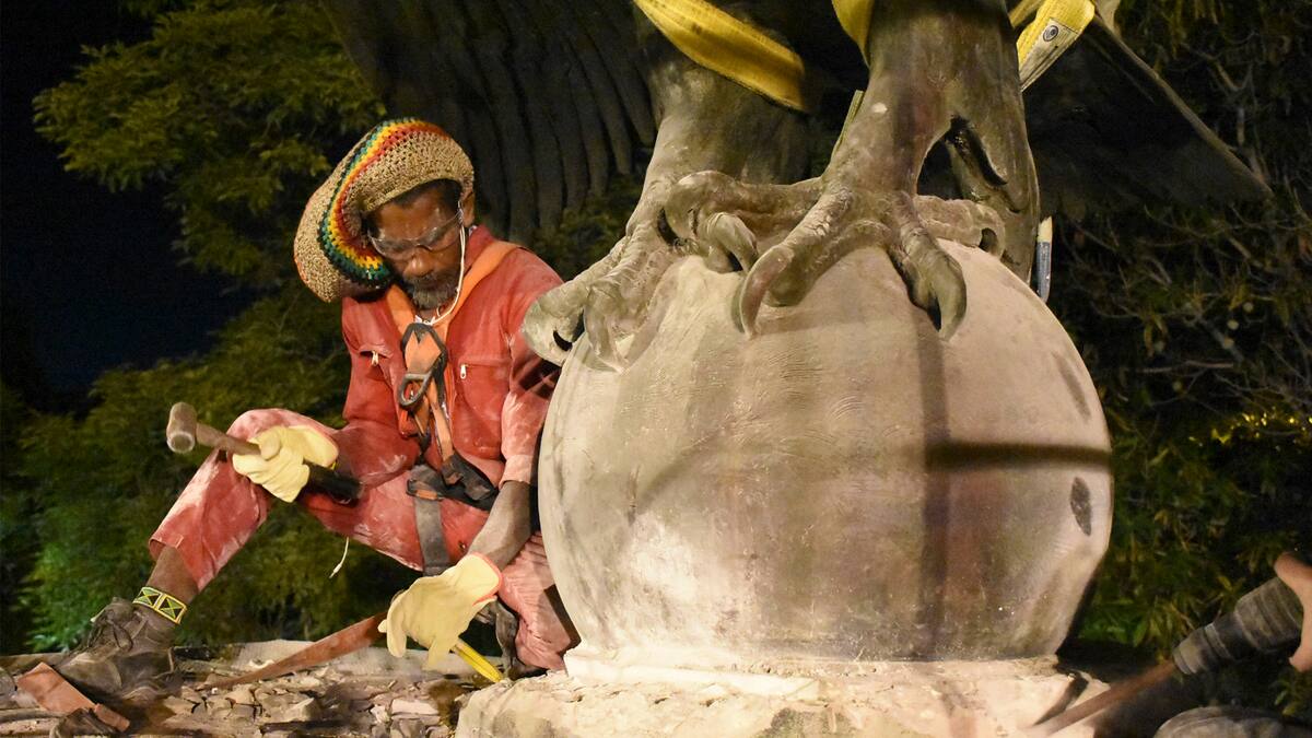 'Durante la maniobra estabilizamos la base de concreto con el águila, que luego fue anclada a una grúa para su liberación con cabuyas especiales. Una vez en tierra fue dispuesta en una cama baja, acondicionada con base de madera para soportar el peso', explicó el director del Grupo Conservar, Salim Osta Lefranc.