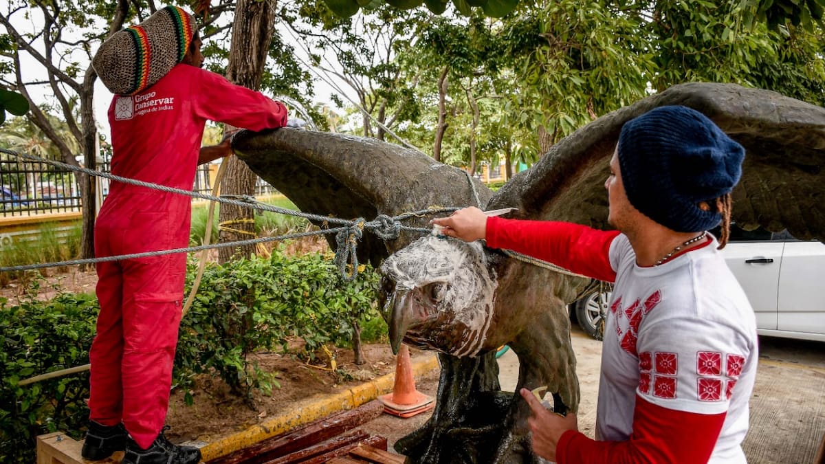 La robusta y pesada ave cambió de hábitat por 45 días, pues ahora posa sus alas en el edificio de la Aduana, donde inició un proceso de restauración, de la mano de dos técnicos restauradores del Grupo Conservar, una firma cartagenera especializada en el tema.
