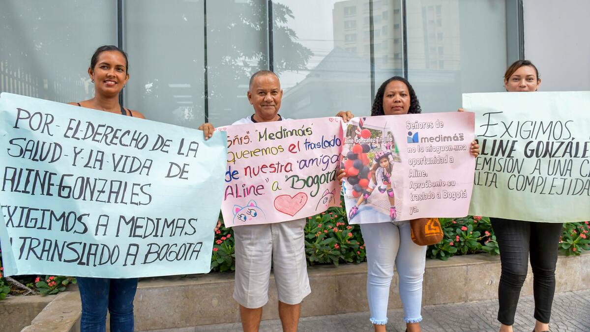 Una semana después de que hicieran pública la denuncia, la madre de Aline, en compañía de su abogada y de otros padres de familia del club de patinaje Las Nieves, del que hace parte su hija, se plantaron en las oficinas administrativas de Medimás, en el tercer piso de un edificio en la carrera 51b con calle 80, para seguir exigiendo que remitan a la niña a una clínica de Bogotá, proceso que no ha sido autorizado por la EPS.