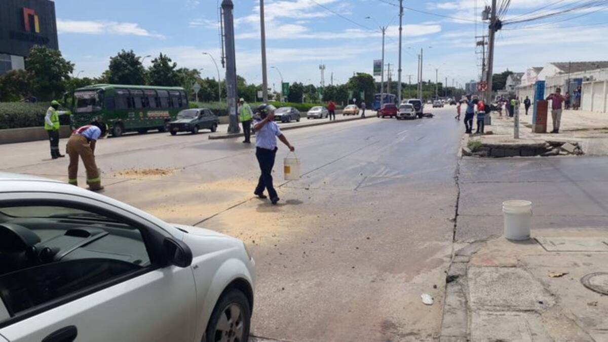 El Cuerpo de Bomberos y la Oficina de Gestión del Riesgo con el apoyo de la Policía, la Secretaría Distrital de Movilidad y la Triple A en una rápida reacción, tras el llamado de la comunidad, desplegaron un operativo de atención y de control en la zona. 'En el lugar hicieron presencia dos máquinas de bomberos y un vehículo de rescate con arena', dijo el teniente Fonseca. Los organismos realizaron el barrido de la sustancia y como medida preventiva expandieron arena sobre la vía para evitar deslizamientos vehiculares.