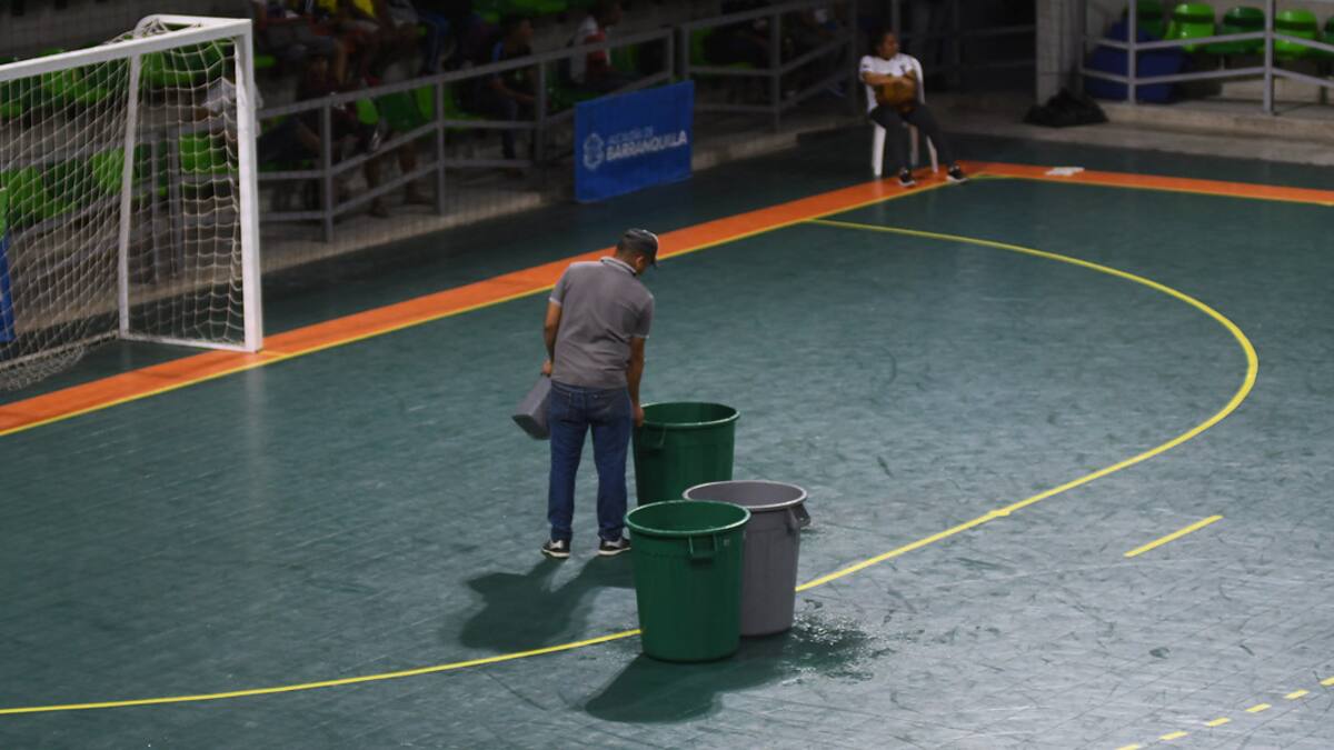 Ante esta situación, los encargados de servicios generales del escenario deportivo ubicaron varios tanques de basura para evitar que ciertas zonas de la cancha de voleibol siguieran mojándose.