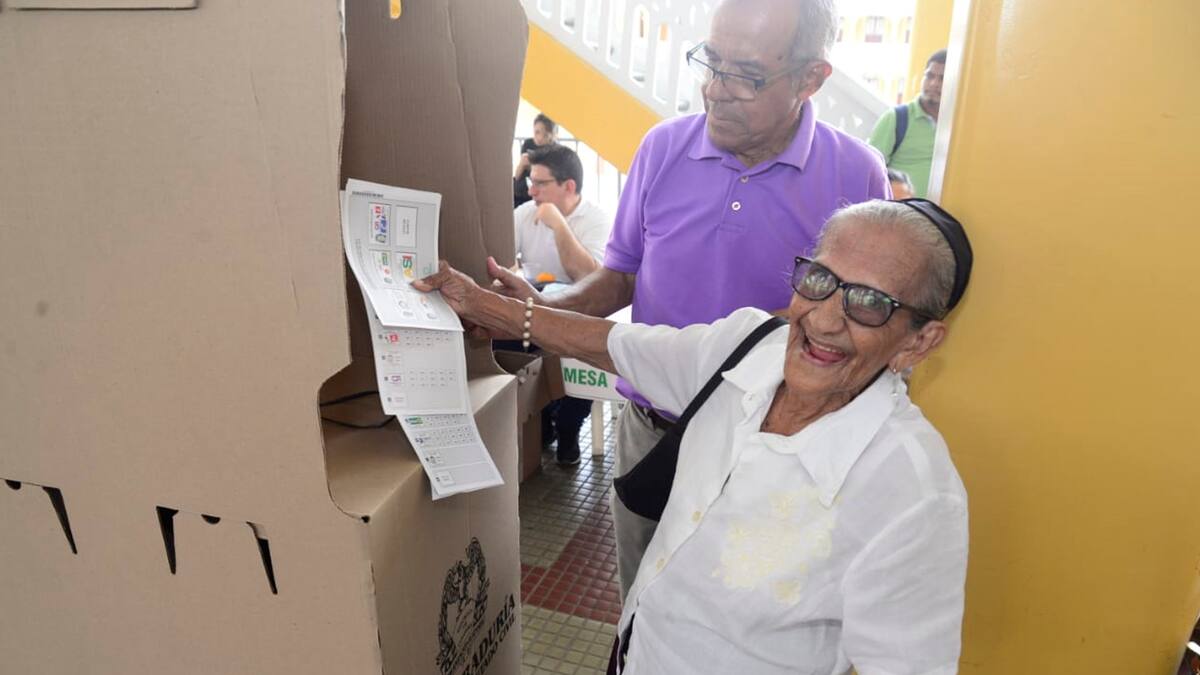 Rosina Pallares de Pacheco, a sus 95 años, no deja de ejercer su derecho al voto. Desde las 5:00 de la mañana alistó sus cosas para cumplirle la cita a la democracia y así fue como antes de llegar el mediodía votó a conciencia por sus candidatos afines en el Instituto La Salle.