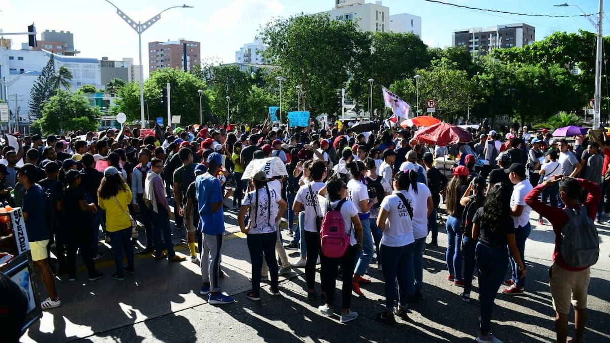Más de un centenar de estudiantes están reunidos a las afueras de la Universidad Autónoma y de Sao de la 93, sobre la carrera 46, mientras esperan el inicio de la marcha.