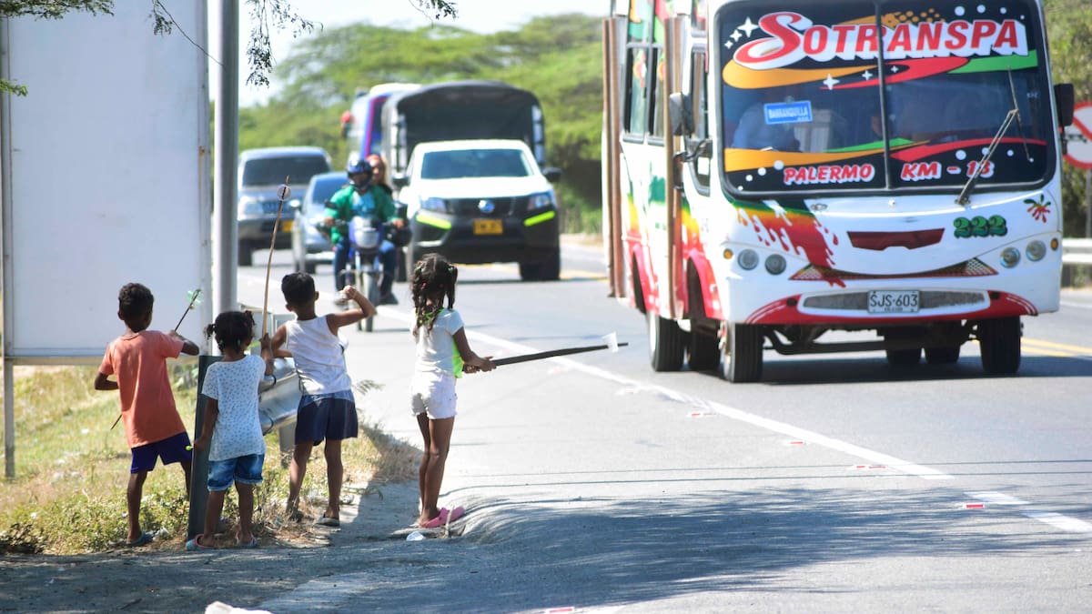 A orillas de la carretera, niños entre 4 y 6 años se dedican a pedir dinero a los conductores de vehículos que transitan por el lugar, poniendo en riesgo su vida. La situación se registra en el kilómetro 14, a la altura del corregimiento de Palermo, jurisdicción de Sitionuevo (Magdalena).