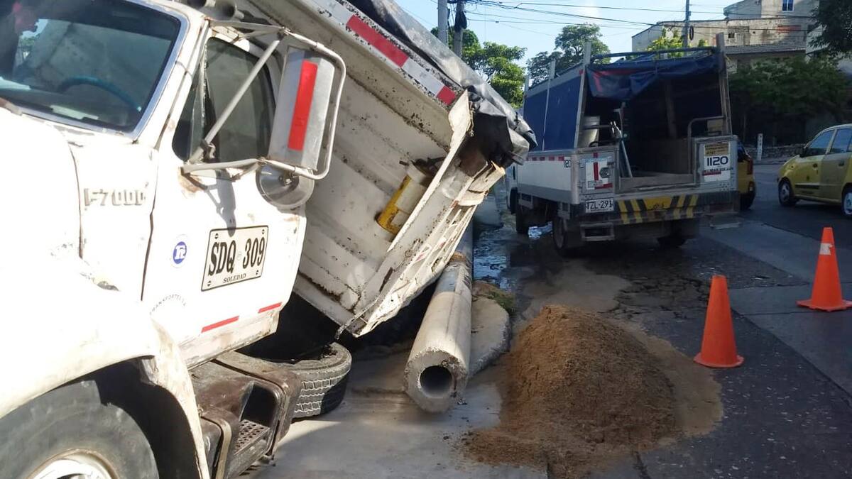 La volqueta de placa SDQ 308, también rompió una tubería 'madre' de agua potable, que ocasionó la interrupción del servicio en el sector.