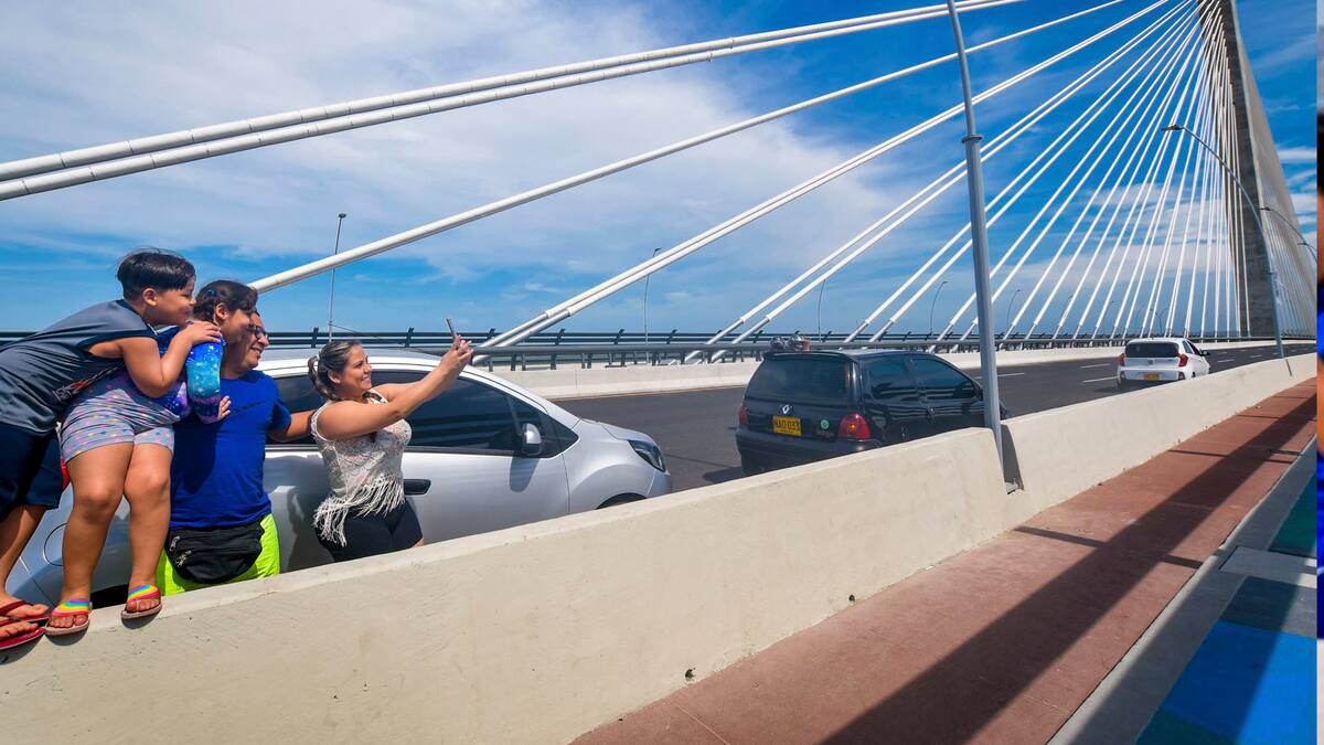 Al tiempo que la zona peatonal se colmaba de visitantes, vehículos transitaban a menos de 80 kilómetros/hora por esta estructura, algunas personas se detenían, se bajaban y abrían sus brazos en plena vía —sin temor alguno y sin miedo a una infracción— para sacar una fotografía. Otros, en búsqueda una imagen más impactante, tal vez para Instagram o Facebook, luchaban contra las ventoleras decembrinas y se subían a las barandas que dividen la zona peatonal de los carriles del puente.