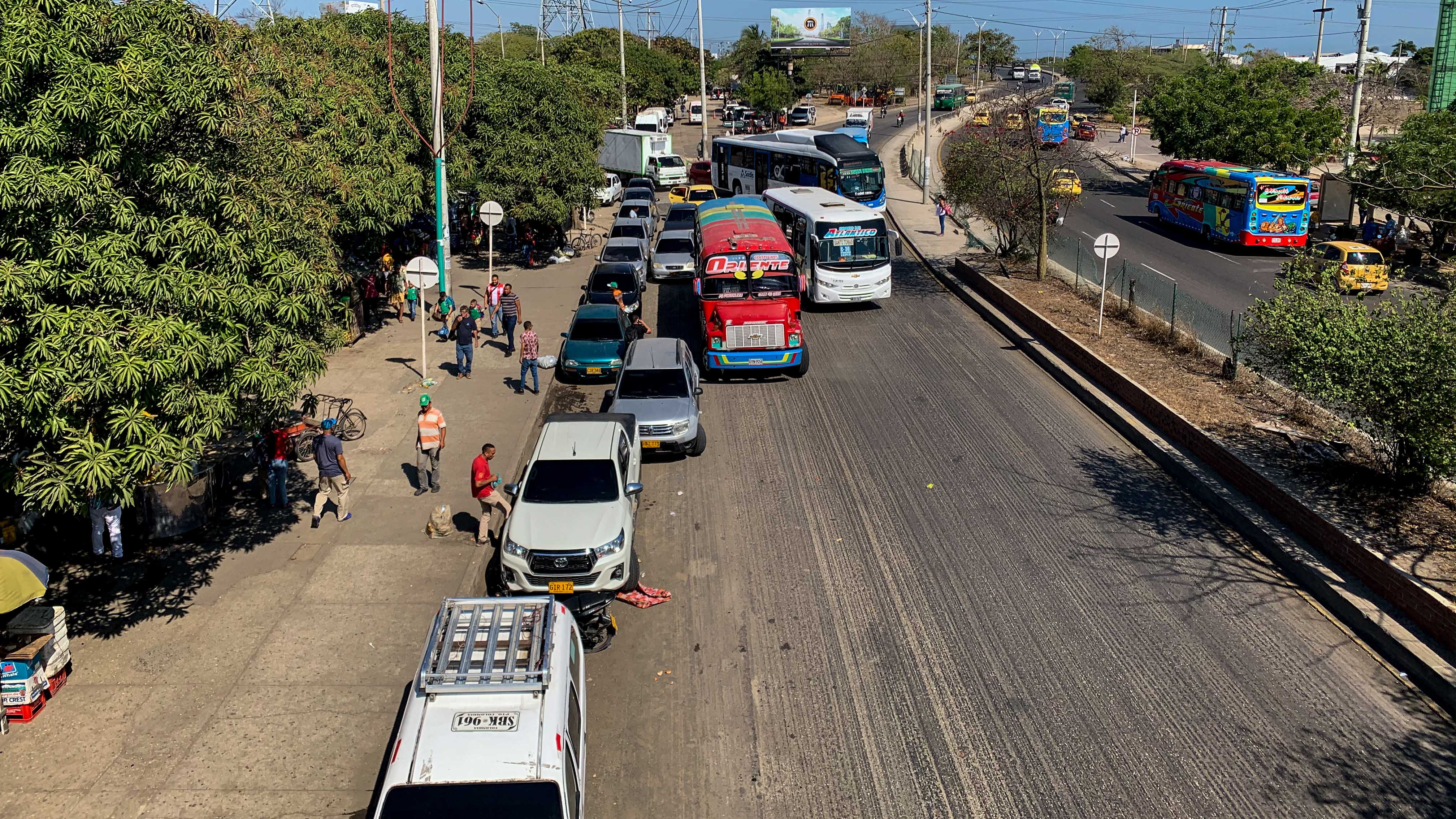 Son unos 20 automotores, entre particulares, buses y vehículos tipo van los que permanecen estacionados en uno de los carriles de la calzada de la calle 30 que va hacia el aeropuerto Ernesto Cortissoz.