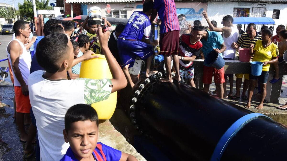 La falta de agua potable, como consecuencia de la suspensión de las actividades en el Acueducto de Barranquilla, llevó a niños, jóvenes y adultos a recoger el agua que brotaba de uno de los 'tubos madre', que pasa por la calle 28 con carrera 23, en el barrio Rebolo.
